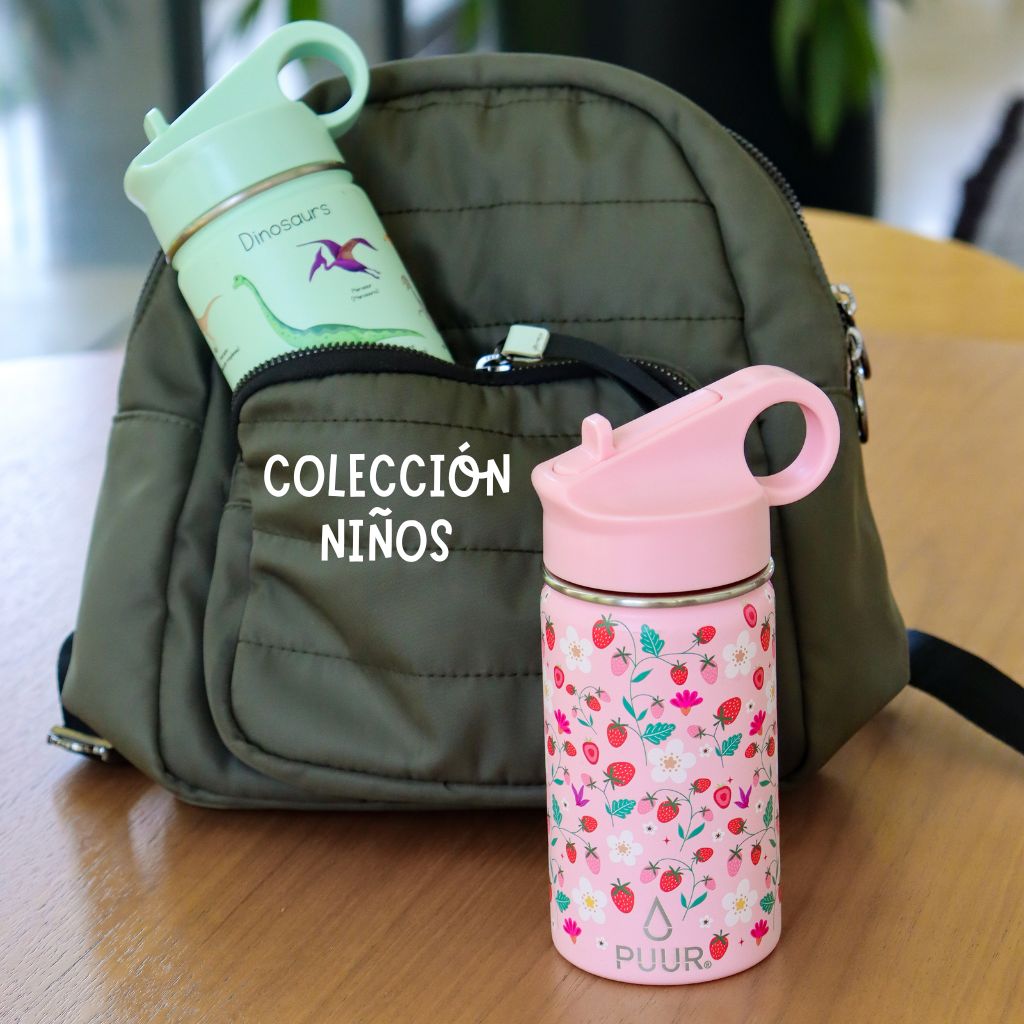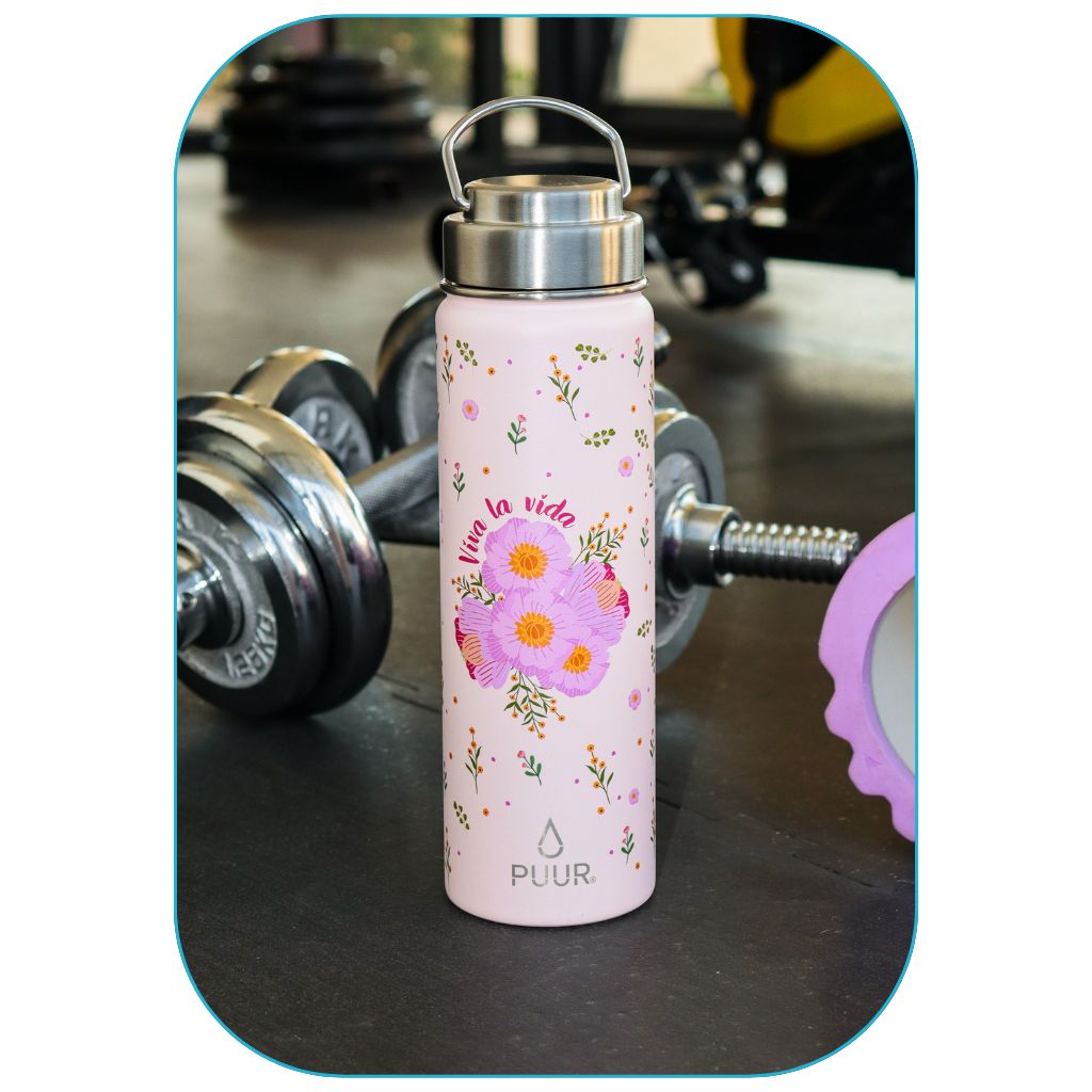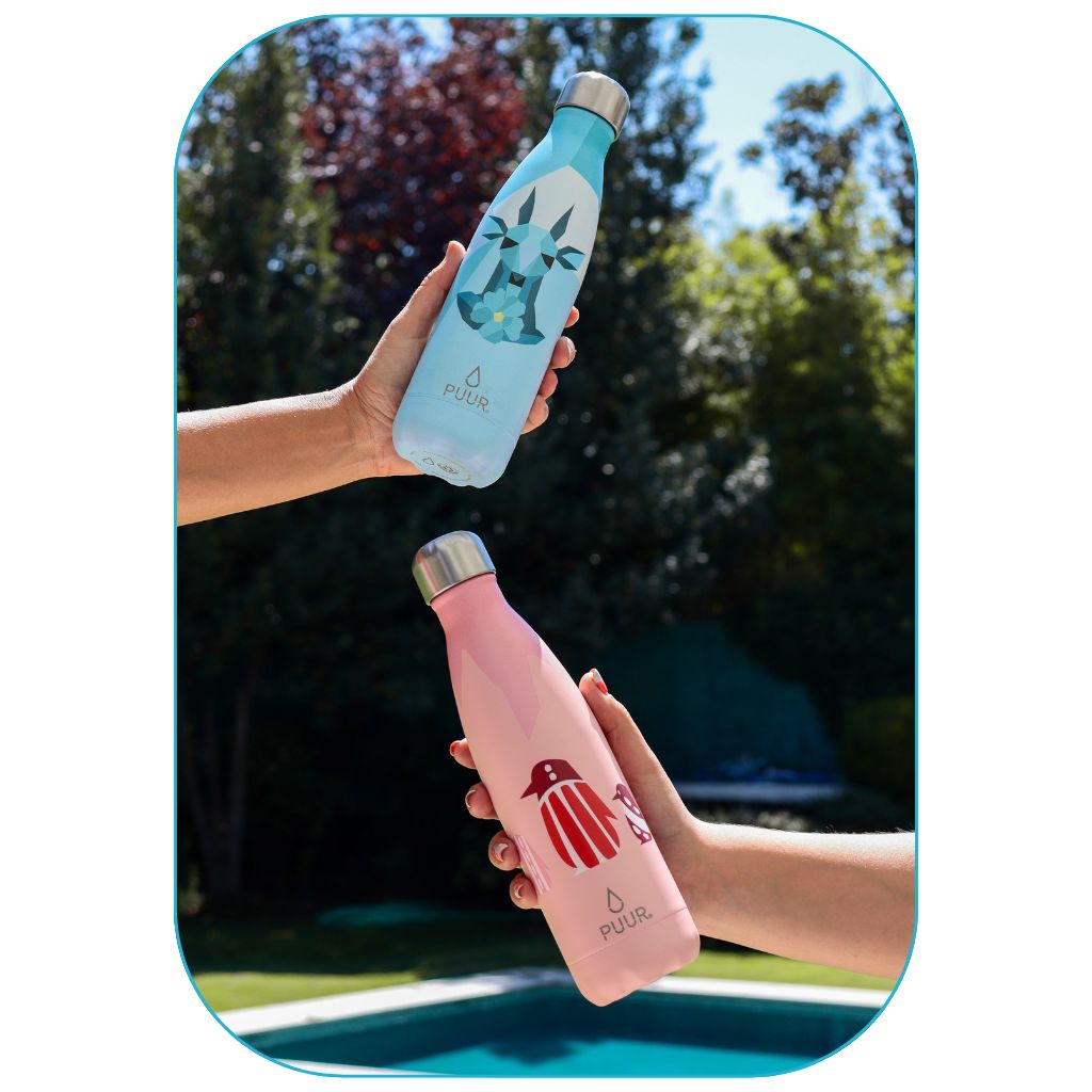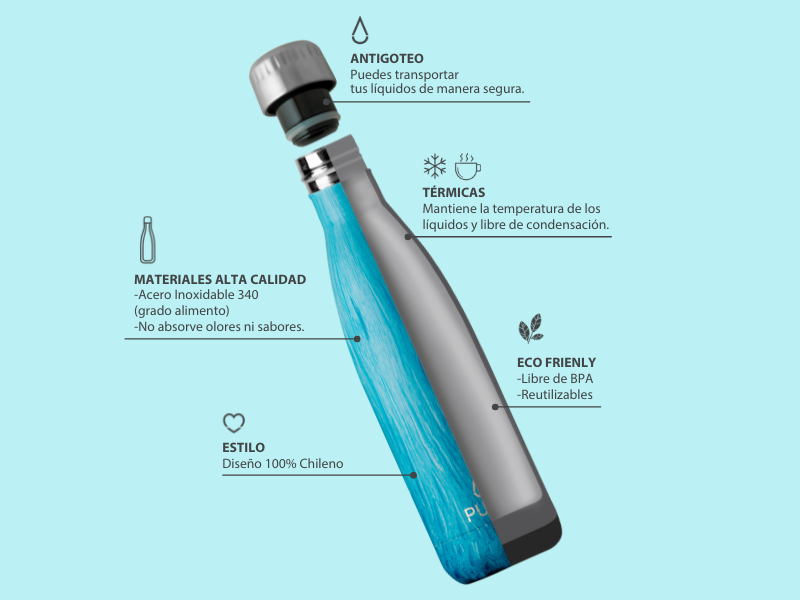 Nuestras Puur Bottle, diseñadas con doble pared de acero inoxidable, libres de condensación y BPA, mantienen la temperatura de los líquidos durante horas.