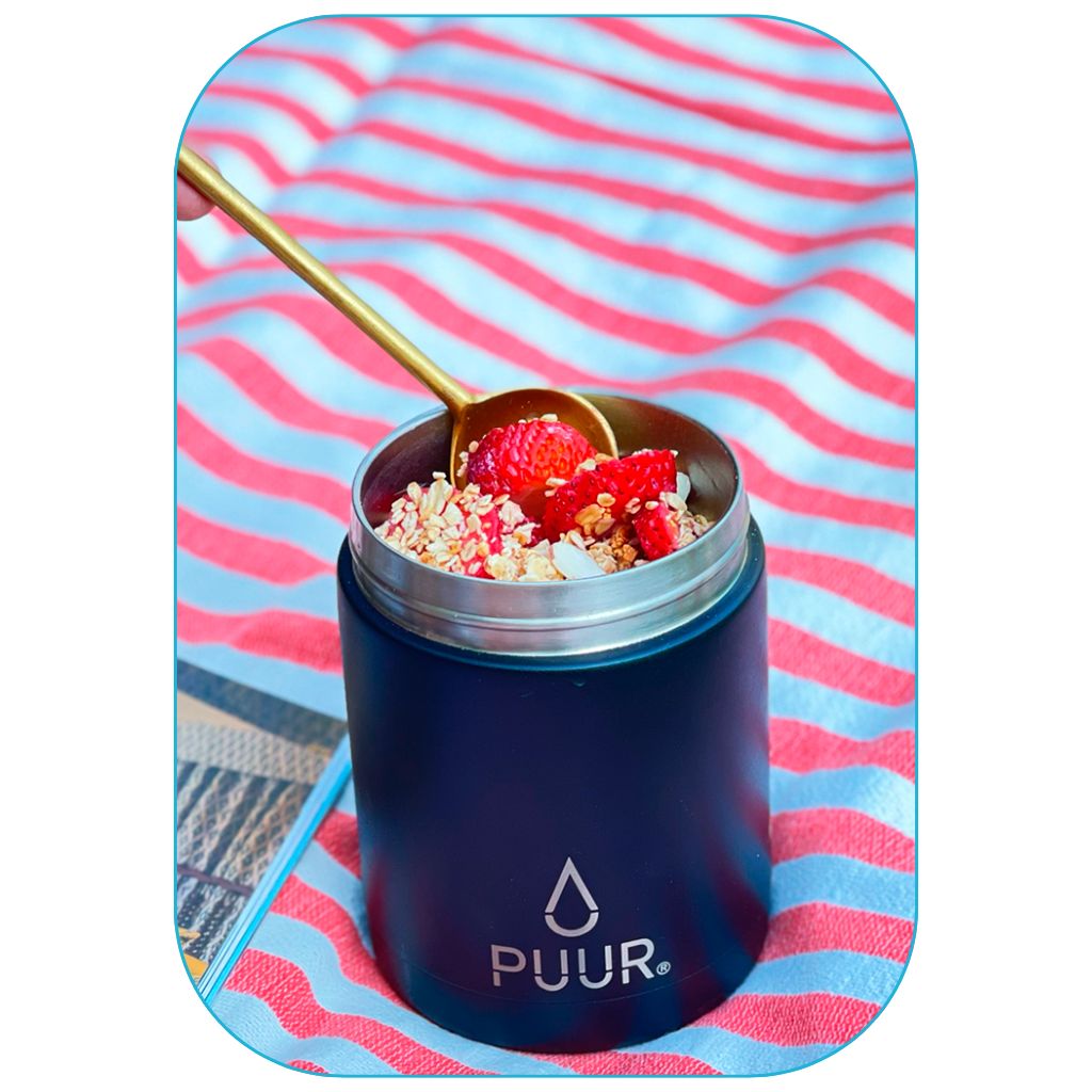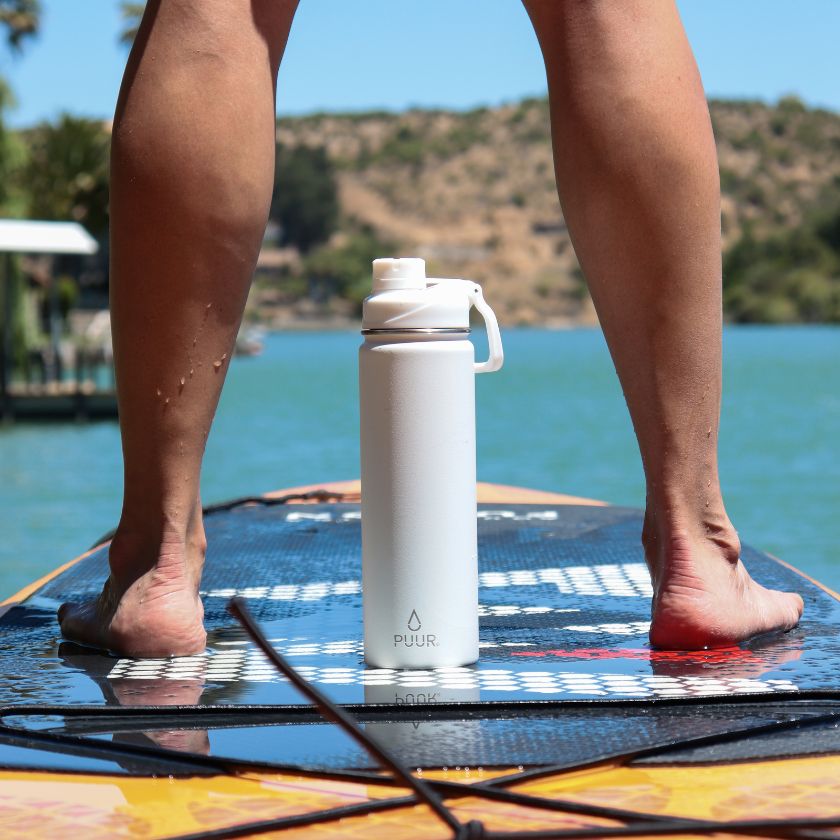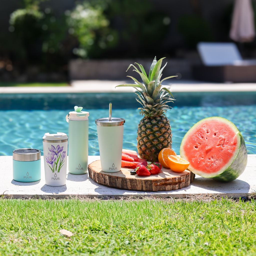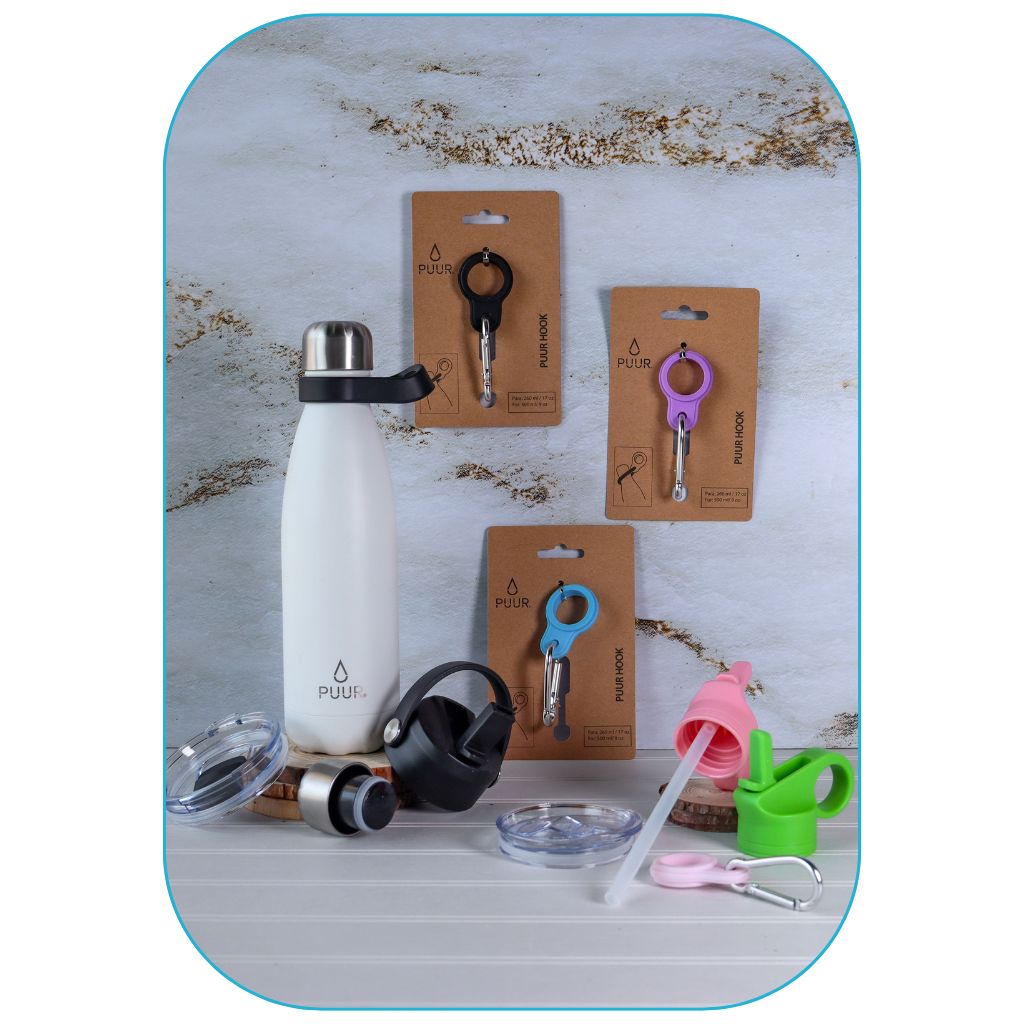 Nuestras Puur Bottle, diseñadas con doble pared de acero inoxidable, libres de condensación y BPA, mantienen la temperatura de los líquidos durante horas.