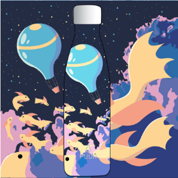 Su ilustración está diseñada en base a su visión del mundo del viaje y la aventura. Quiso combinar lo que sería un maravilloso viaje del mar con uno del aire.