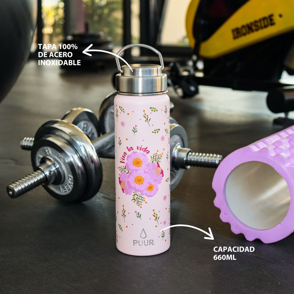 La Botella Térmica Puur Activa Viva La Vida 660 ml es un recordatorio diario de disfrutar cada momento con alegría y energía. Con un diseño floral inspirado en la vitalidad y el color, es el accesorio perfecto para acompañarte en tus entrenamientos, paseos o jornadas largas.
