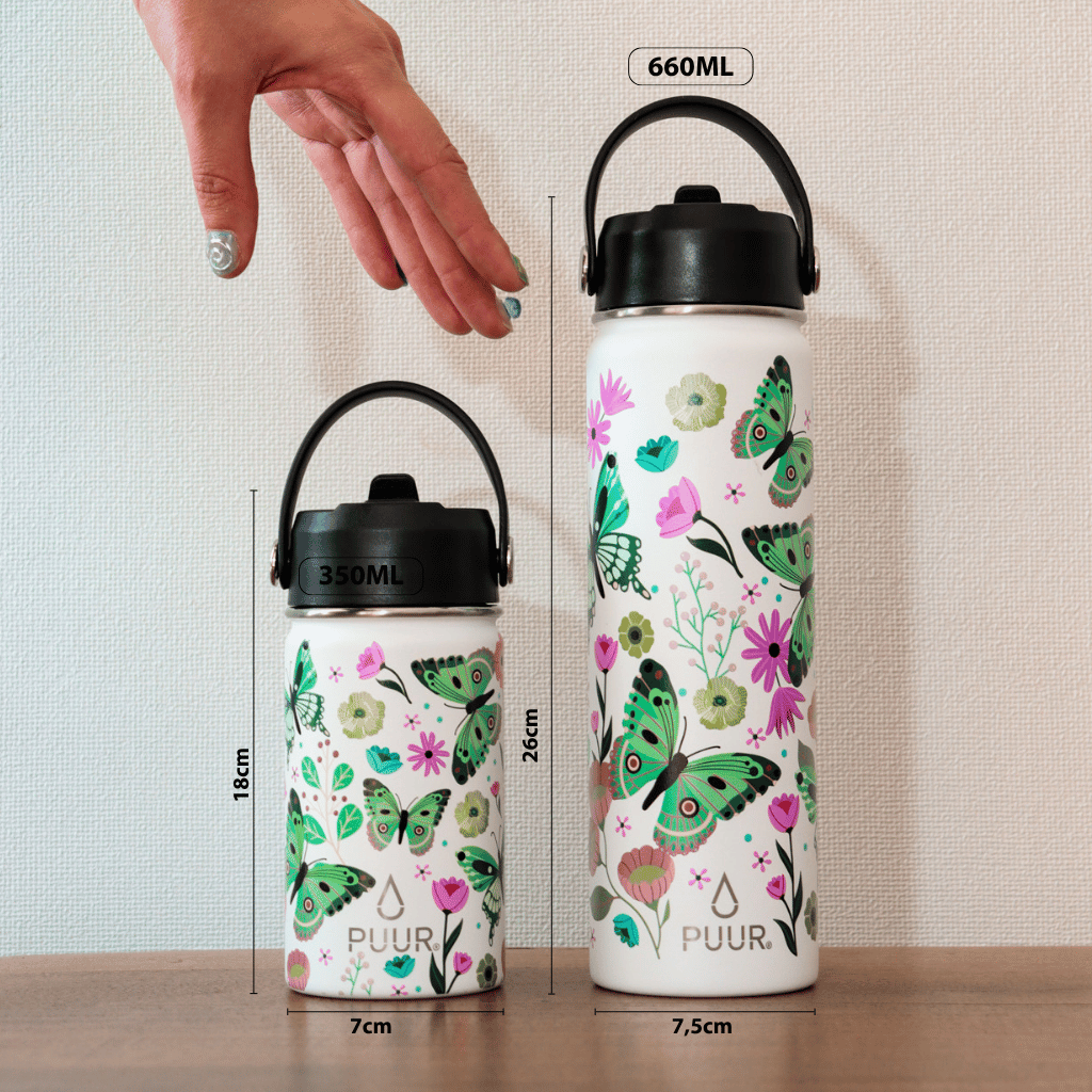 Nuestras botella activas PUUR puedes encontrarlas en estas distintas capacidades: 350 ml, 600 ml, 660ml y 1000ml.