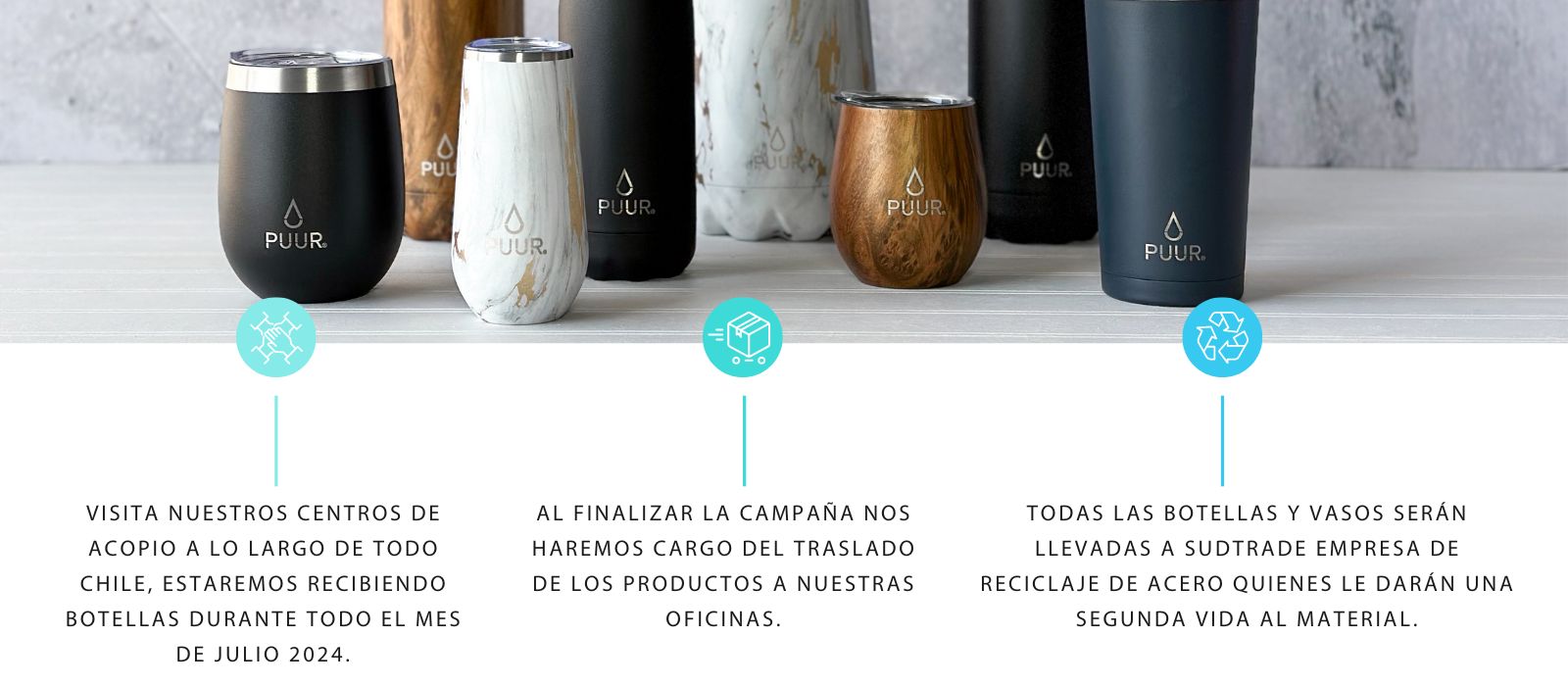 En Puur, recogemos botellas de acero inoxidable para reciclar y nos aseguramos de que cada botella recolectada tenga un destino claro y responsable.