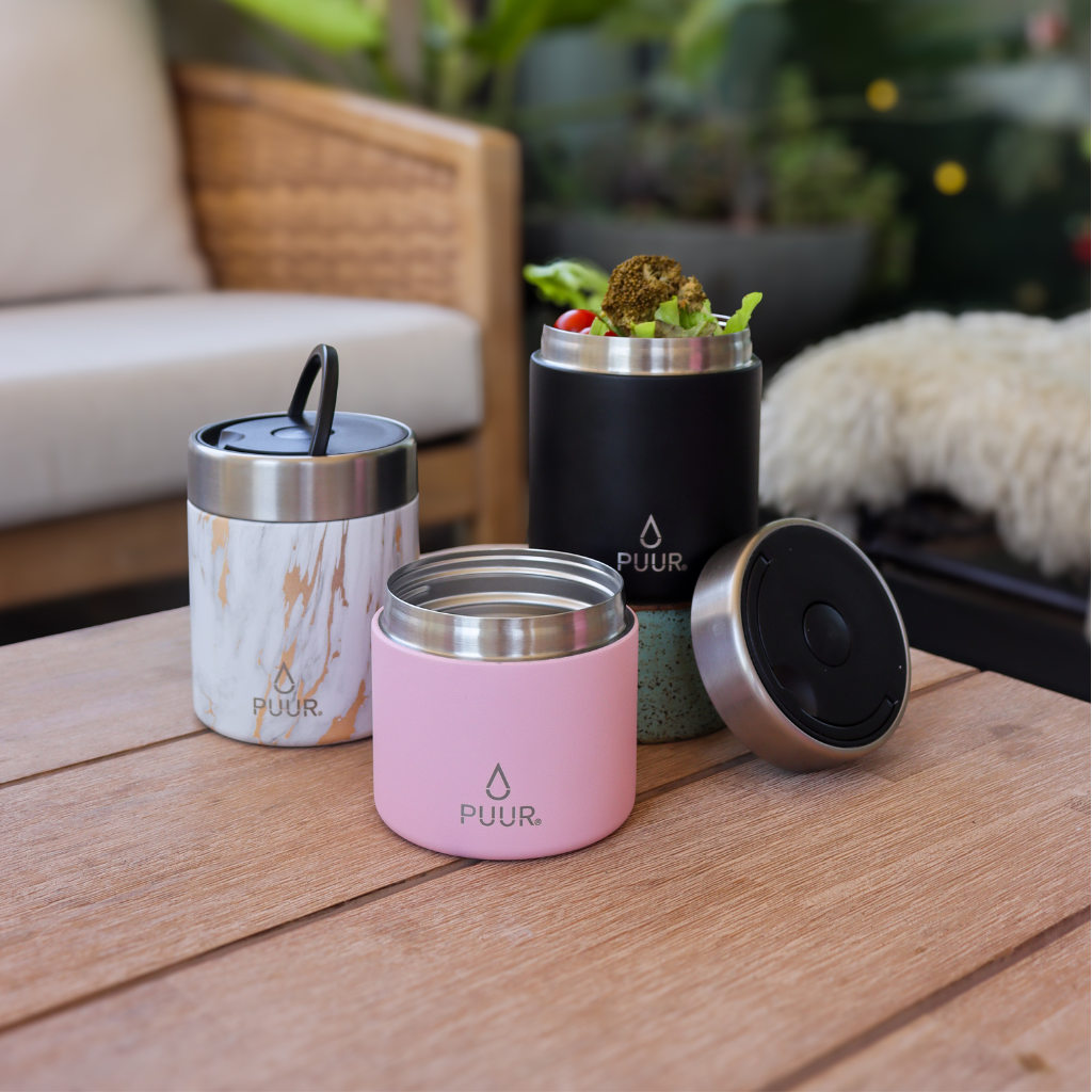 Los termos de comida Puur están hechos de docle capa de acero inoxidable 304 o grado alimento y una capa de cobre en su interior. Su doble pared y sello inferior impiden la variación extrema de temperatura y evita que transpire al contacto con la mano.